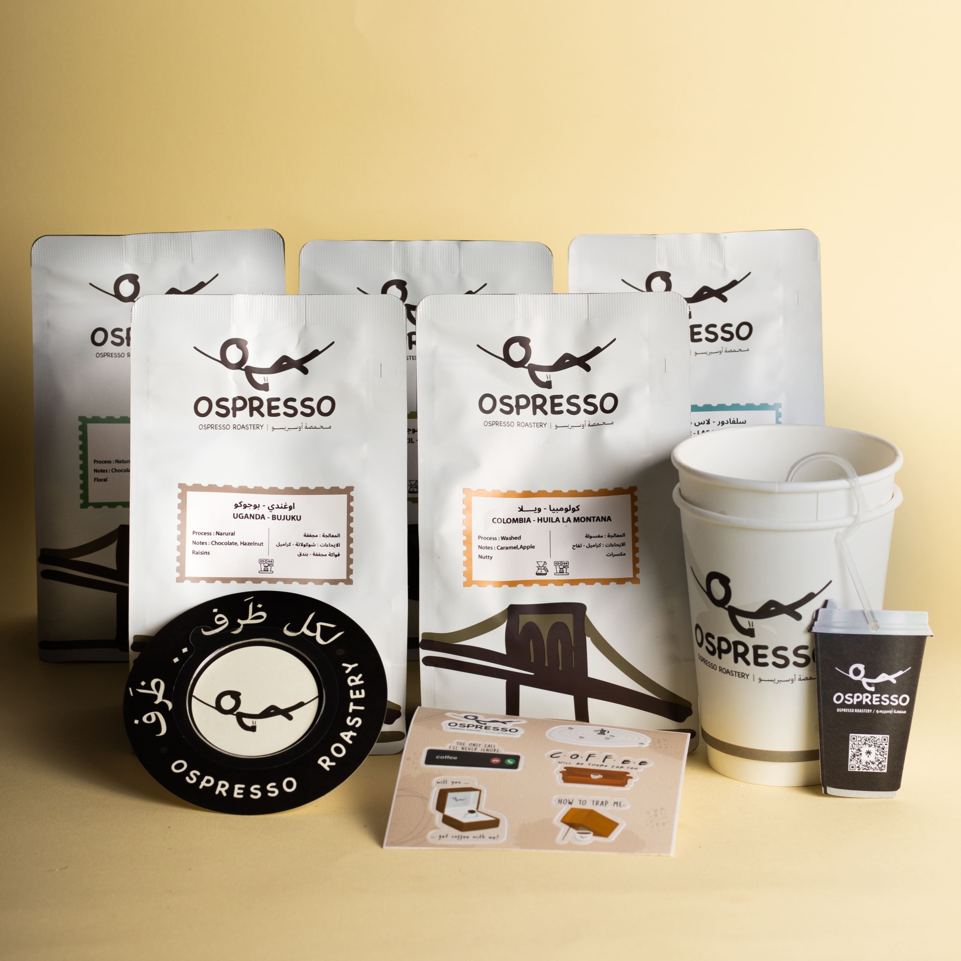 بوكس القهوّجية – ٥ محاصيل مختصة (٢٥٠ جم) + ٣ أظرف قهوة وأكواب - محمصة أوسبريسو Ospresso Roastery